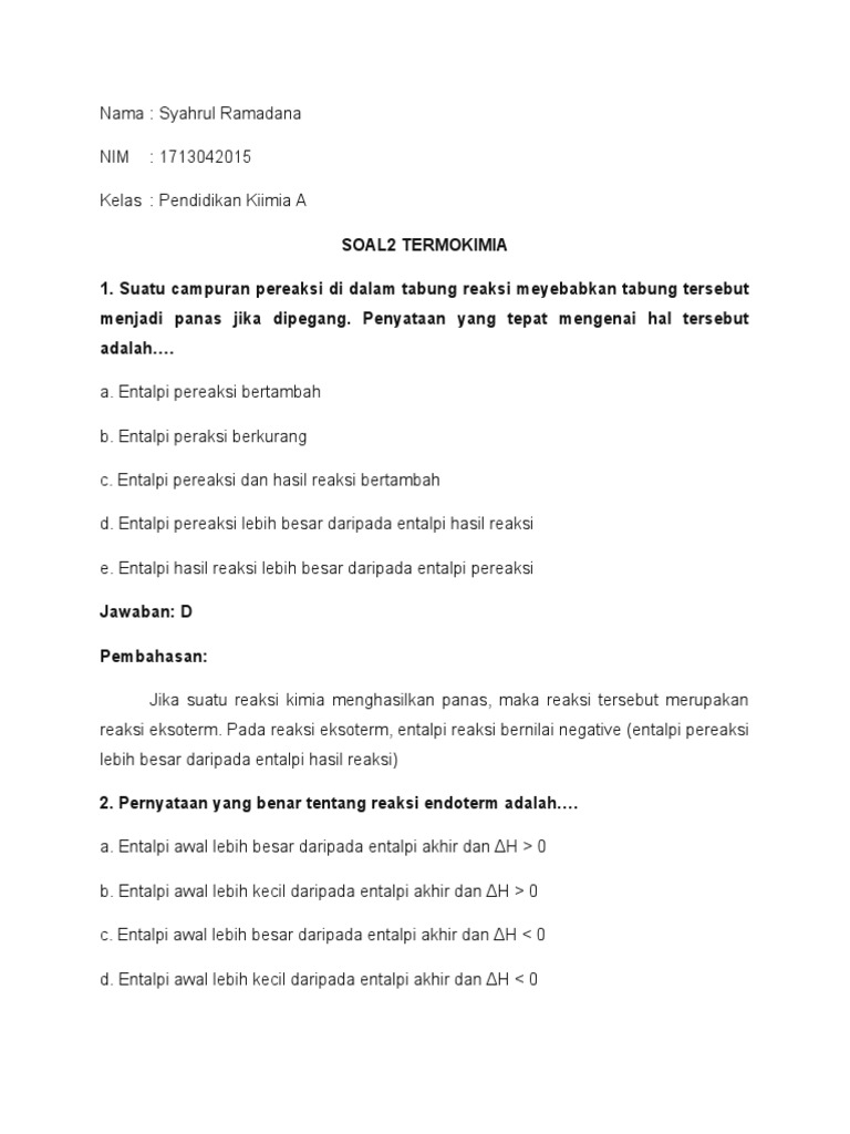 Entalpi hasil reaksi lebih besar daripada. Materi dan contoh soal termokimia part 1 video materi dan contoh soal termokimia kelas 11 part 2 : Entalpi pereaksi lebih besar daripada entalpi hasil reaksi. Suatu campuran pereaksi di dalam tabung reaksi meyebabkan tabung tersebut menjadi panas jika dipegang. Pada termodinamika gas ideal mengalami proses isotermik jika a. Penyataan yang tepat mengenai hal tersebut adalah…. Penyataan yang tepat mengenai hal tersebut adalah…. 872020 untuk lebih jelasnya perhatikan contoh soal gerak parabola dan pembahasannya dibawah ini. Penyataan yang tepat mengenai hal tersebut adalah…. Penyataan yang tepat mengenai hal tersebut adalah…. Jika sepotong logam barium direaksikan dengan asam klorida encer pada sistem terbuka dengan reaksi: 8 dan 4 detik b. Pembahasan soal soal termokimia kelas xi suatu campuran pereaksi di dalam tabung reaksi meyebabkan tabung tersebut menjadi panas jika dipegang.