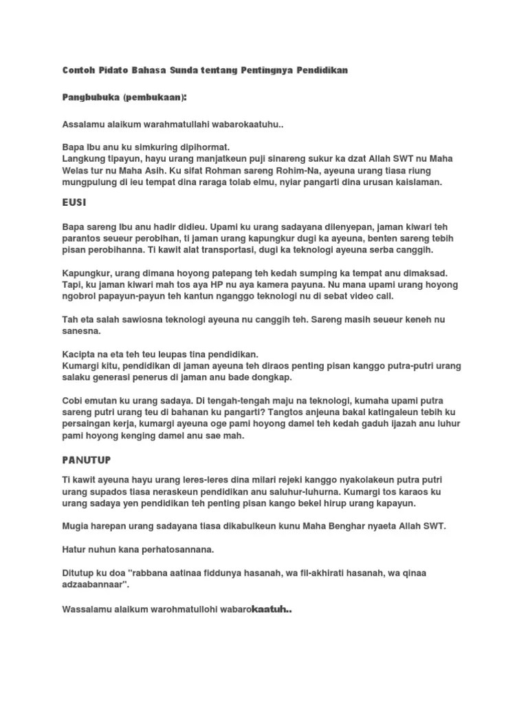 Mugia harepan urang sadayana tiasa dikabulkeun kunu maha benghar nyaeta allah swt. Contoh teks pidato singkat yang akan mimin bahas seperti pidato tentang pendidikan bahasa indonesia agama islam tentang al quran pidato pembangkit semangat . Dijaman kiwari pendidikan teh penting pisan, pendidikan pikeun elmu mere loba kapalan pikeun urang salarea. Pidato bahasa sunda pendek dan singkat tentang pendidikan. Contoh pidato bahasa sunda singkat tentang pendidikan kebersihan perpisahan.